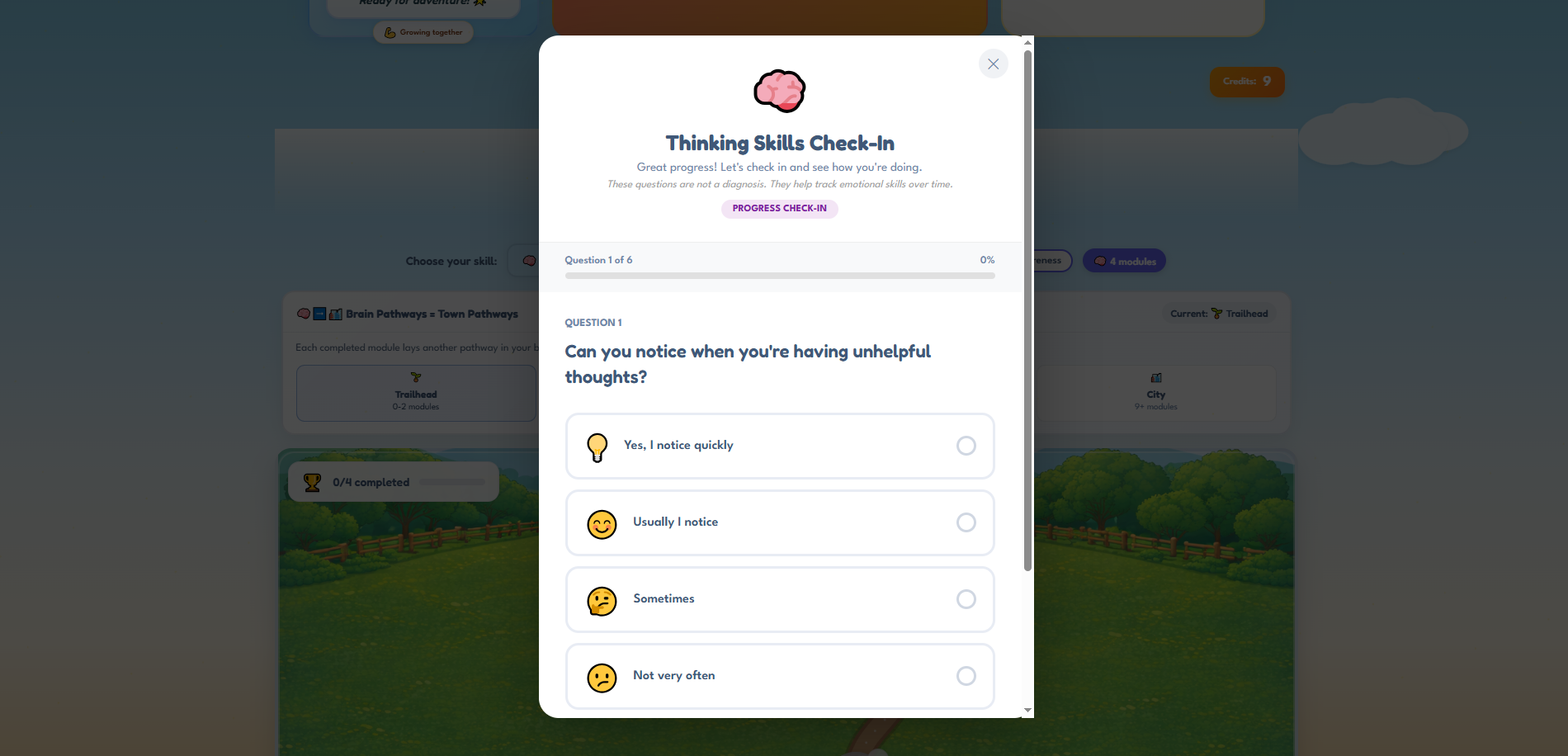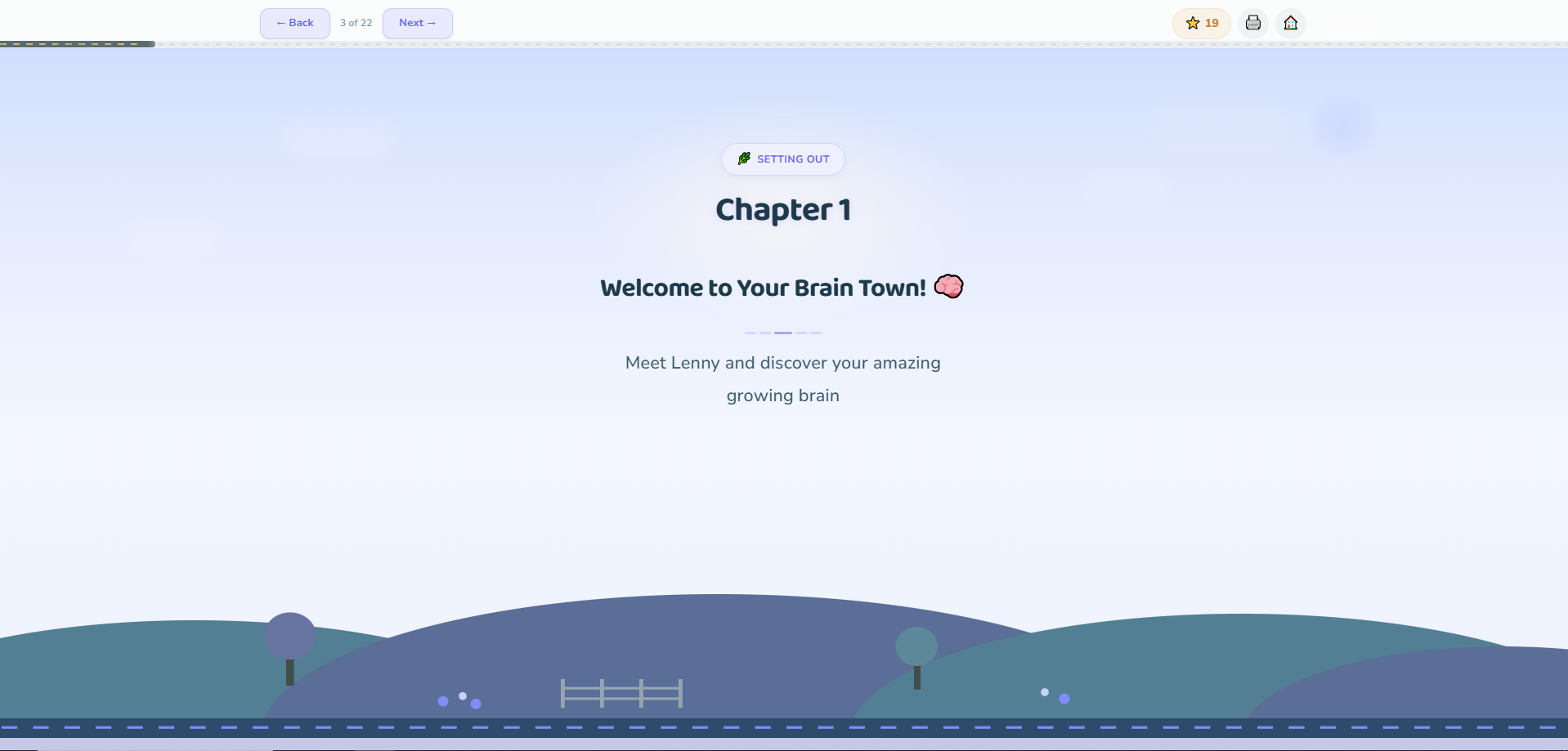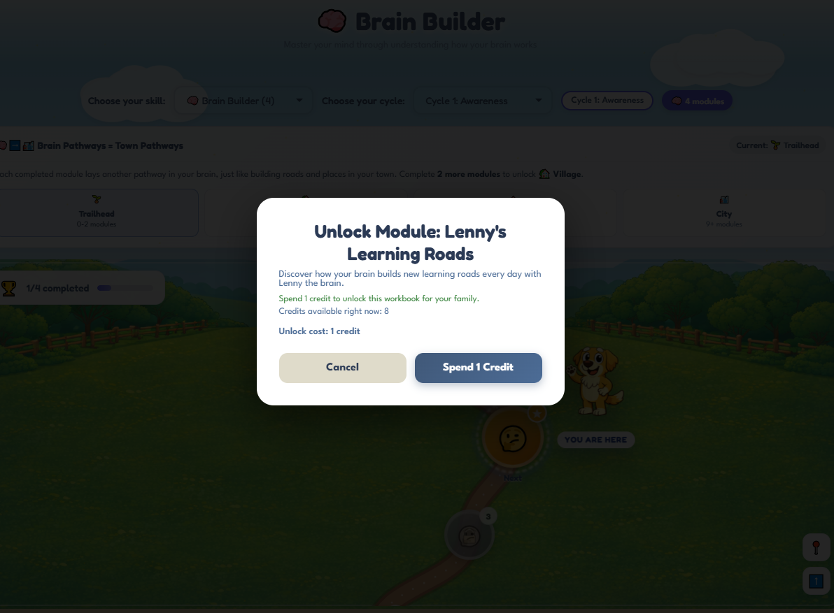 As children complete modules, they help their Brain Town grow - starting as a small village and expanding into a thriving town and eventually a city. Each new pathway represents emotional skills being strengthened through practice.